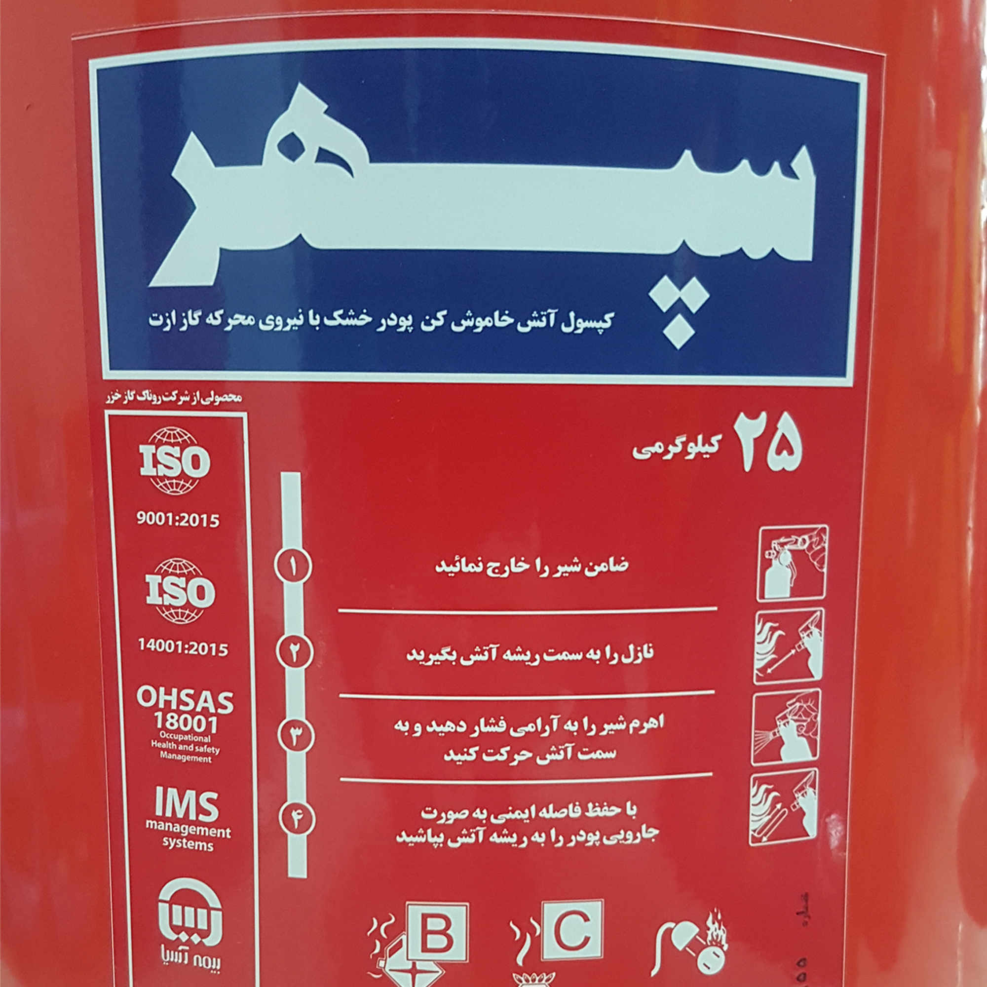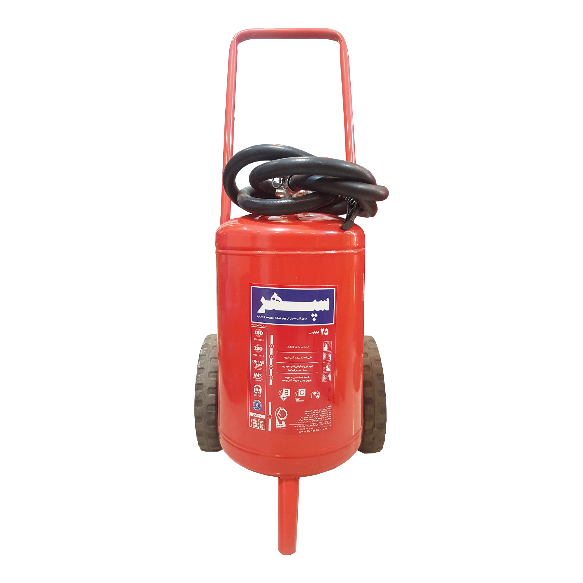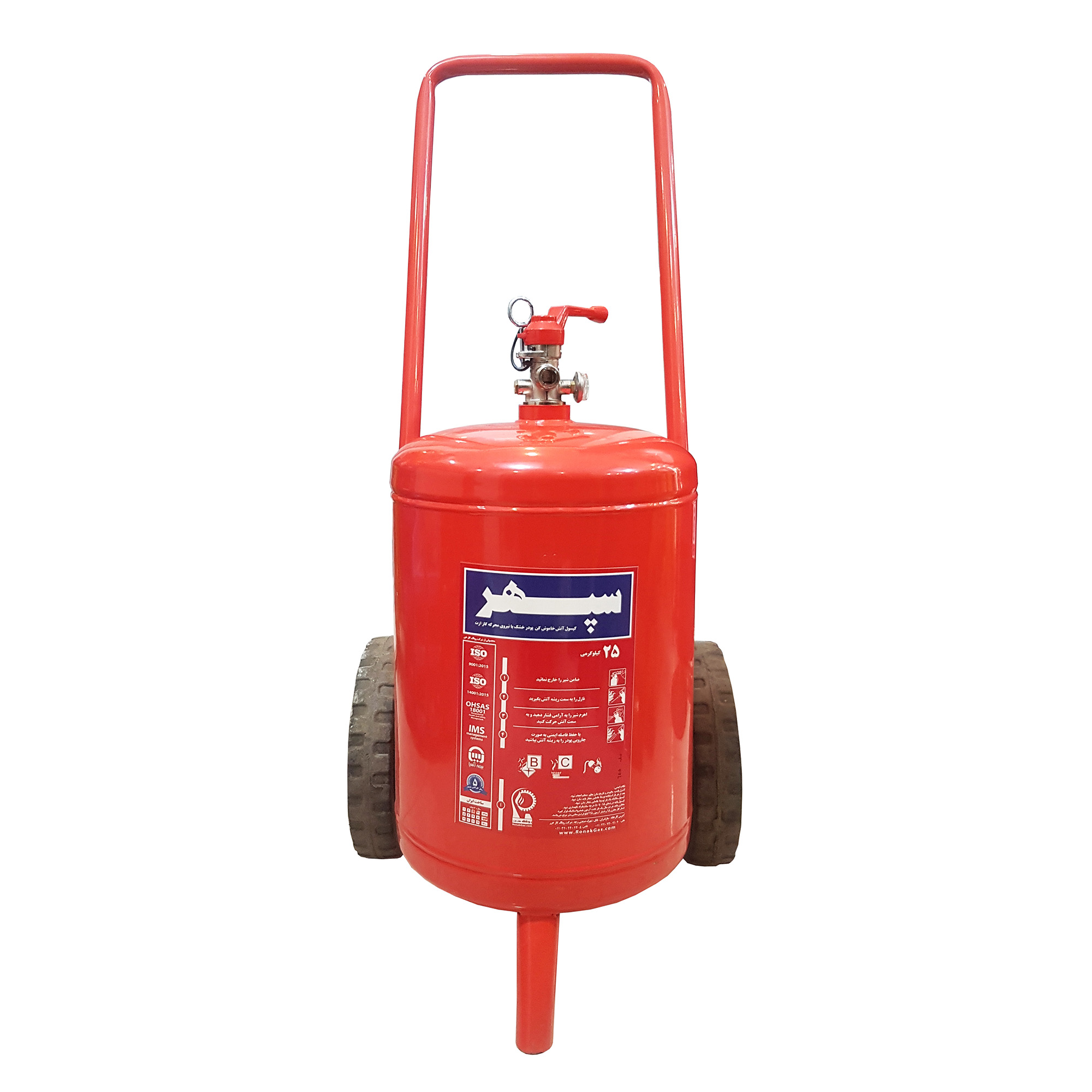 کپسول های آتشنشانی یا خاموش کننده های دستی، حاوی پودر مخصوص اطفای حریق بوده و در خاموش کردن شعلههای آتش در لحظات اولیه و پیش از گسترش آن، بسیار موثر می باشند. این کپسولها دارای ظرفیت ها و اوزان مختلف هستند که باید با توجه به نوع کاربری و شرایط محیطی، کپسول مناسب انتخاب شود. کپسول 25 کیلویی آتشنشانی پودری BC تولید شرکت سپهر از نوع چرخدار بوده و مناسب فضاهای های صنعتی متوسط و موتورخانه ها و دارای نشان استاندارد ملی بوده و قابلیت شارژ مجدد دارد. این محصول دارای یک فشارسنج می باشد که با مشاهده آن می توان وضعیت شارژ کپسول را ارزیابی نمود. برای استفاده از این محصول کافی است آنرا بر روی چرخهای آن هل داده و به محل حریق نزدیک نمایید، سپس ضامن آن را خارج کرده و خروجی نازل کپسول را به سمت شعلههای آتش نشانه بگیرید. سپس دستگیره را فشار داده و مسیر پاشش پودر را بهصورت جارویی حرکت دهید. این کپسول دارای شیلنگ می باشد. کپسول های آتش نشانی باید سالیانه یک مرتبه جهت کنترل وضعیت و در صورت نیاز شارژ مجدد، به مراکز مجاز شارژ سپرده شوند.