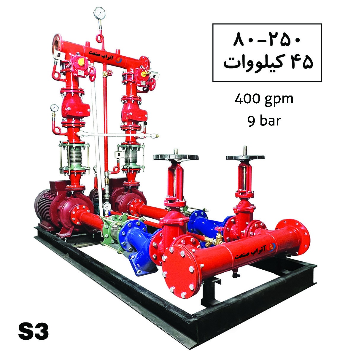 این محصول، بوسترپمپ 3 خط آتش نشانی (بوستر پمپ کلاس S3) به صورت کامل و شاسی شده شامل تمامی قطعات و تجهیزات مورد نیاز است. در این محصول دو پمپ اصلی مدل 250-80 به ظرفیت 45 کیلووات (60 اسب بخار) و یک پمپ جوکی استفاده شده و مناسب نصب در ساختمان های S3 بر اساس محاسبات هیدرولیکی است. سایز خط مکش و دهش پمپ ها 4 اینچ می باشد. هر خط در قسمت مکش دارای صافی، شیر OS&Y و لرزه گیر و در قسمت دهش مجهز به شیر یکطرفه، شیر باترفلای UL، لرزه گیر و انشعاب بای پس است. هر پمپ دارای پرشر سوییچ و مانومتر جداگانه بوده و جهت انجام عملیات عیب یابی خودکار، کلکتور دهش مجهز به خط تست با شیر برقی است. در کنار این محصول، تابلو برق دوتایی پمپ آتش نشانی مجهز به سیستم خودسرویس نیز عرضه می شود. تابلوبرق مجهز به PLC جهت راه اندازی خودکار پمپ و توانایی تشخیص خطا، دارای لوازم مرغوب، با قابلیت ارسال سیگنال فالت و فایر به اعلام حریق می باشد. محصولات تولیدی این مجموعه، منطبق بر ضوابط سازمان آتشنشانی تهران ساخته شده و مسئولیت تاییدیه آن نیز به عهده این مجموعه می باشد. جهت دریافت اطلاعات بیشتر و استعلام قیمت تماس بگیرید.