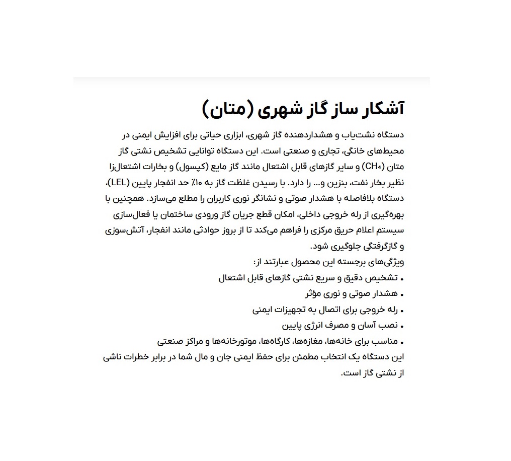 دستگاه نشت یاب و هشدار دهنده گاز شهری ، ابزاری حیاتی برای افزایش ایمنی در محیط های خانگی ، تجاری و صنعتی است . این دستگاه توانایی تشخیص نشتی گاز متان (CH4) و سایر گازهای قابل اشتعال مانند گاز مایع ( کپسول) و بخارات اشتعال زا نظیر بخار نفت ، بنزین و ... دارد. با رسیدن غلظت گاز به 10 درصد حد انفجار پایین ( LEL) ، دستگاه بلافاصله با هشدار صوتی و نشانگر نوری کاربران را مطلع می سازد. همچنین با بهره گیری از رله خروجی داخلی ، امکان قطع جریان گاز ورودی ساختمان یا فعالسازی سیستم اعلام حریق مرکزی را فراهم می کند تا از بروز حوادثی مانند انفجار ، آتش سوزی و گاز گرفتگی جلوگیری شود.