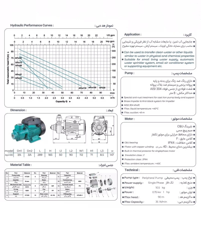 پمپ محیطی 1 اسب ارتفاع بالا مدل APm90 در کنار پمپ APm75 بیشترین تقاضا را دارند. پمپ آب یک اسب محیطی لئو APm90 به دلایلی که در ادامه ذکر خواهد شد به طور گسترده در سیستم تقویت آب مسکونی، اطلاع حریق، انتقال آب به برج خنک کن، انتقال و پمپاژ آب در باغات و مصارف صنعتی و نیمه صنعتی مورد استفاده قرار میگیرد. داشتن گارانتی 2 ساله، خدمات پس از فروش 10 ساله، موجود بودن قطعات یدکی، مکش بیشتر نسبت به پمپهای بشقابی، تامین هد ماکسیمم 90 متر و دبی 2.1 متر مکعب بر ساعت سبب شده پمپ 1 اسب ارتفاع بالا لئو (APm90) مورد توجه بازار مصرف قرار بگیرد. پمپ APm90 از برند لئو ساخت چین است و از دیگر ویژگیهای مهم آن سیم پیچی مسی و مجهز بودن به محافظ گرمایی (Built-in thermal protector) اشاره کرد.
